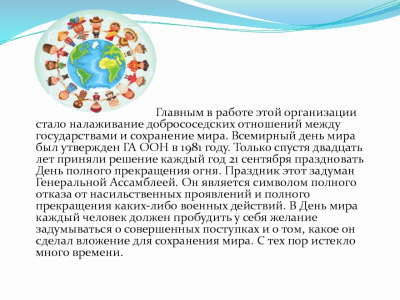 проблемы, они только еще сильнее усложняют жизнь, неся с собой смерть, несчастья и горе. "Миру мир!" - кричат на всех языках. Он должен жить всегда и везде на планете! Всемирный день мира: история праздника То, к чему стремятся все народы, – это мир. Реальным воплощением такого желания стала Организация Объединенных Наций, созданная в конце самой нечеловеческой за всю историю войны 1939-1945 годов.