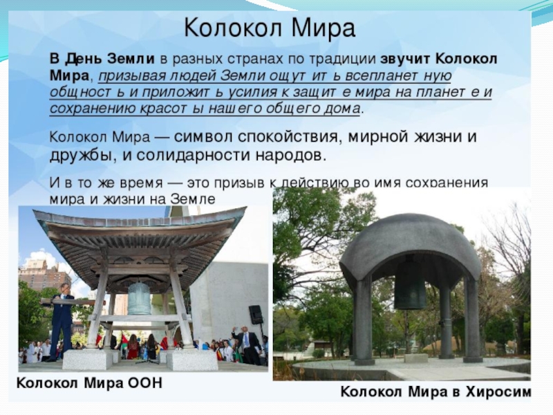 Колокола Мира установлены во многих городах мира как символ мира, дружбы, братства и солидарности народов, что проживают в нашем общем доме под названием Земля. Своим звоном они призывает всех защищать мир на нашей планете и сохранять ее красоту. Их звон – это напоминание и призыв к действию. Каждый человек должен помнить, что, если ни он, то кто тогда поможет Земле.