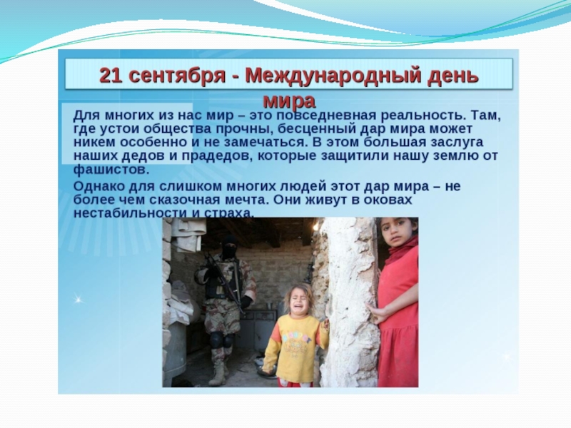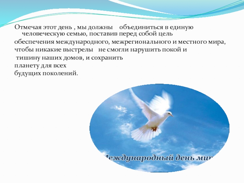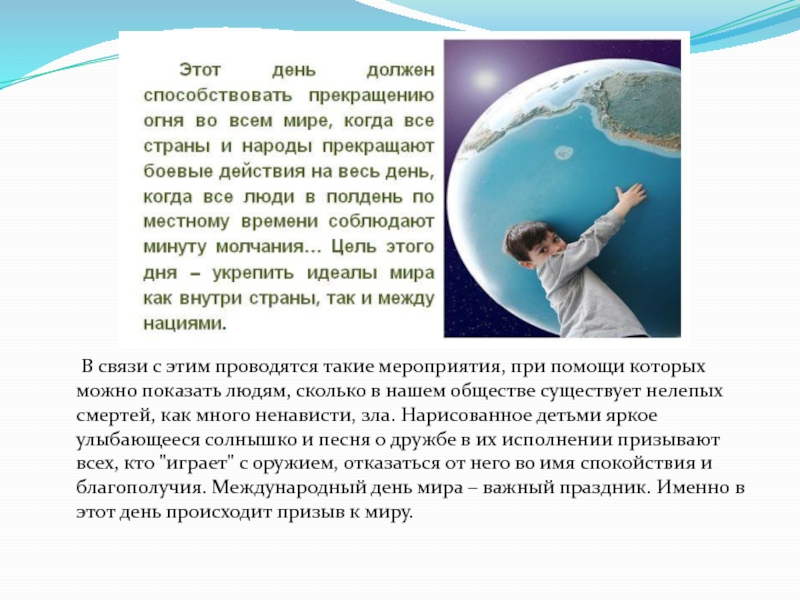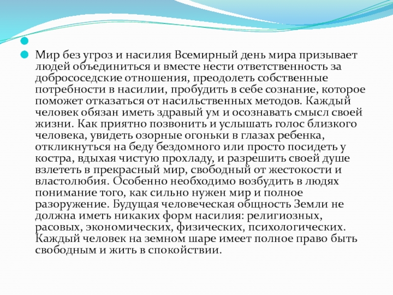 Мир без угроз и насилия Всемирный день мира призывает людей объединиться