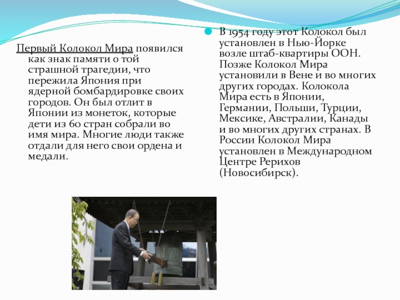 Первый Колокол Мира появился как знак памяти о той страшной трагедии, что