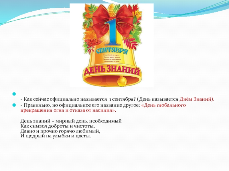 - Как сейчас официально называется 1 сентября? (День называется Днём Знаний).