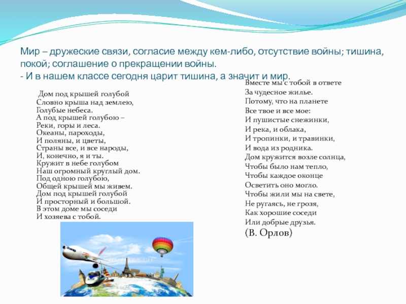 - Толковый словарь дает нам такое объяснение слову «мир»: