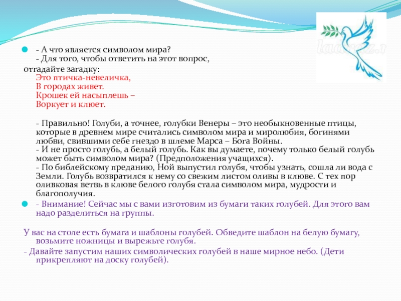 - И не просто голубь, а белый голубь. Как вы думаете, почему только белый голубь может быть символом мира? (Предположения учащихся).