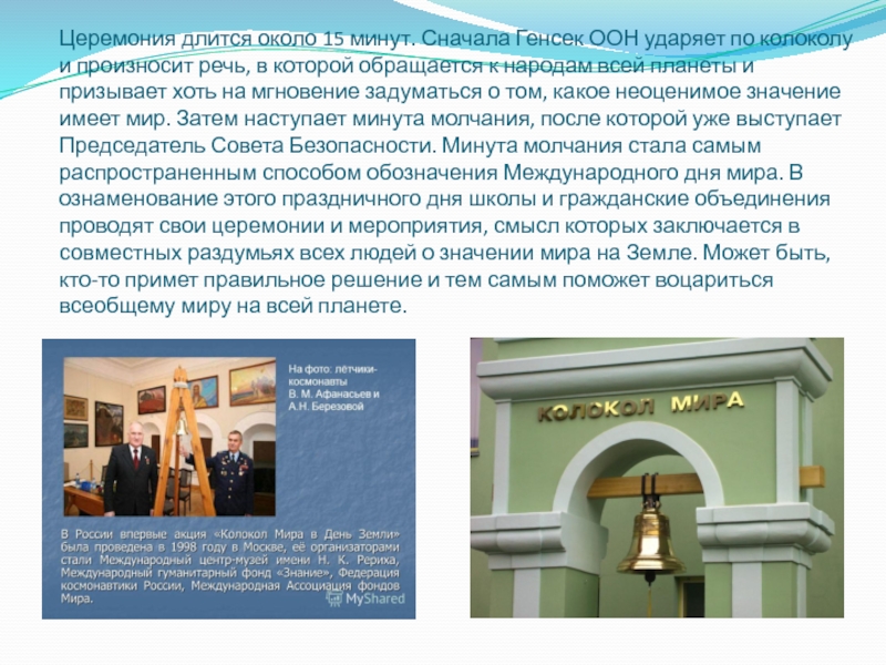 и произносит речь, в которой обращается к народам всей планеты и призывает хоть на мгновение задуматься о том, какое неоценимое значение имеет мир. Затем наступает минута молчания, после которой уже выступает Председатель Совета Безопасности. Минута молчания стала самым распространенным способом обозначения Международного дня мира. В ознаменование этого праздничного дня школы и гражданские объединения проводят свои церемонии и мероприятия, смысл которых заключается в совместных раздумьях всех людей о значении мира на Земле. Может быть, кто-то примет правильное решение и тем самым поможет воцариться всеобщему миру на всей планете.