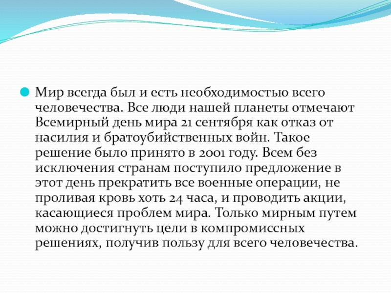 планеты отмечают Всемирный день мира 21 сентября как отказ от насилия и братоубийственных войн. Такое решение было принято в 2001 году. Всем без исключения странам поступило предложение в этот день прекратить все военные операции, не проливая кровь хоть 24 часа, и проводить акции, касающиеся проблем мира. Только мирным путем можно достигнуть цели в компромиссных решениях, получив пользу для всего человечества.
