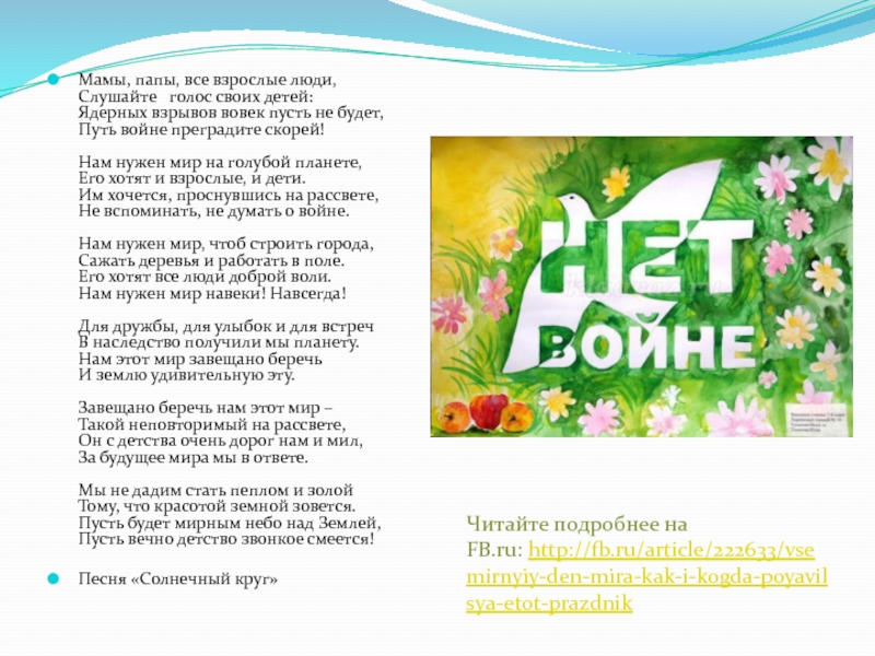 Читайте подробнее на FB.ru: http://fb.ru/article/222633/vsemirnyiy-den-mira-kak-i-kogda-poyavilsya-etot-prazdnik