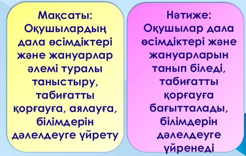 Оқушылар дала өсімдіктері және жануарларын танып біледі, табиғатты қорғауға бағытталады, білімдерін дәлелдеуге үйренеді