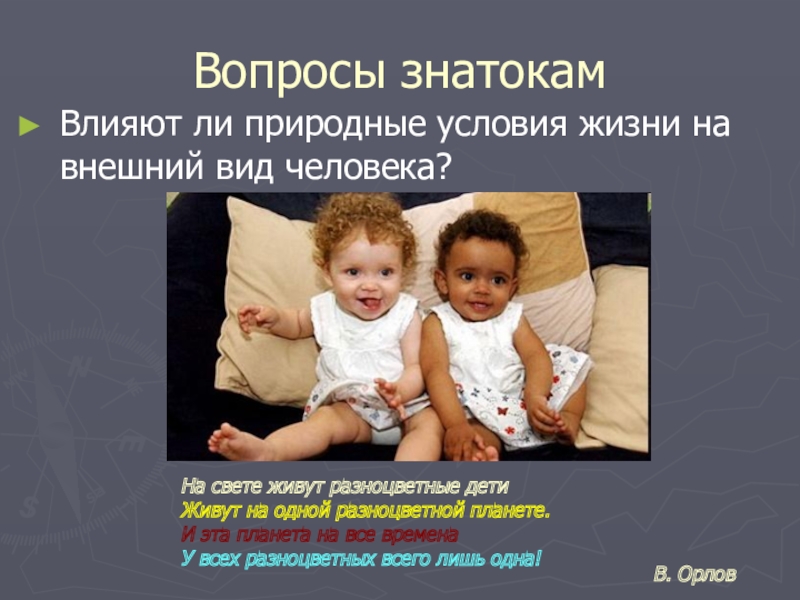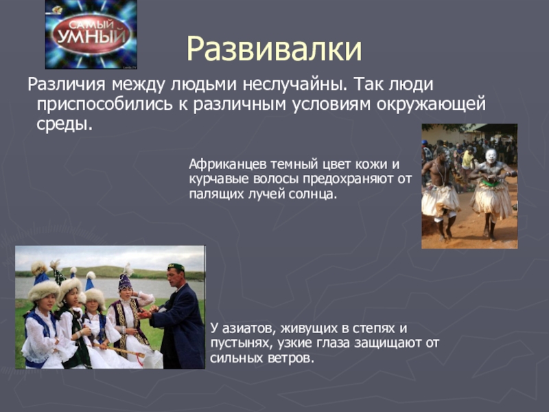 Африканцев темный цвет кожи и курчавые волосы предохраняют от палящих лучей солнца.