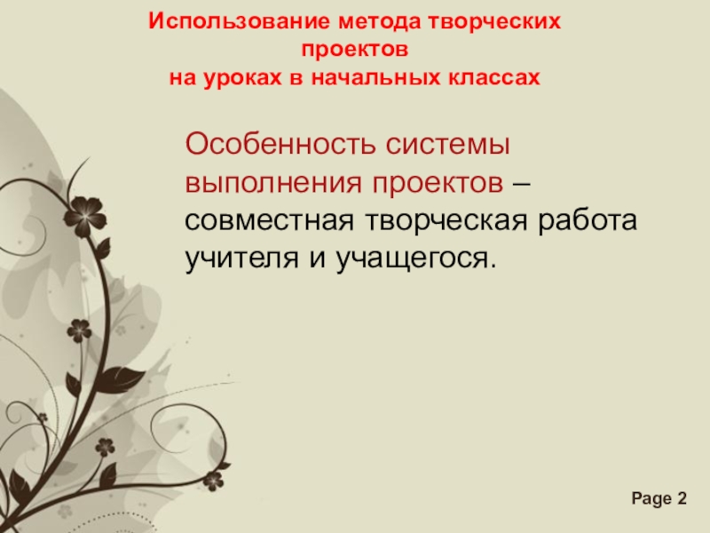 Использование метода творческих проектов на уроках в начальных классахОсобенность системы выполнения проектов – совместная творческая работа учителя и учащегося.