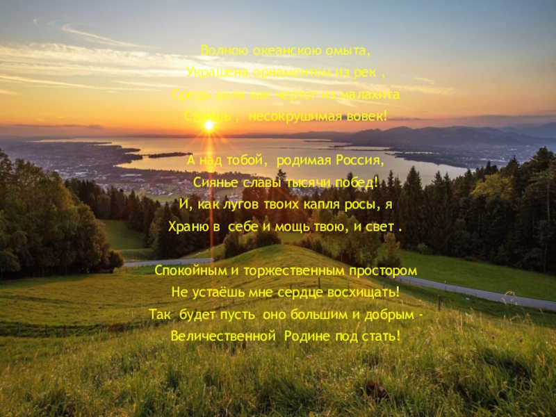 Волною океанскою омыта,Украшена орнаментом из рек ,Средь дола как чертог из малахитаСтоишь ,  несокрушимая вовек! А над тобой,  родимая Россия,Сиянье славы тысячи побед!И, как лугов твоих капля росы, яХраню в  себе и мощь твою, и свет . Спокойным