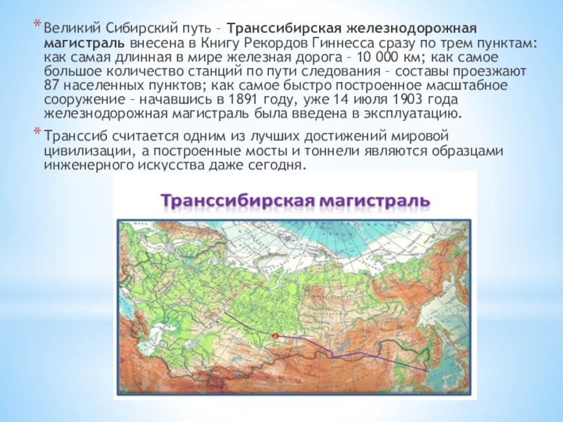 Слайд 9Великий Сибирский путь – Транссибирская железнодорожная магистраль внесена в Книгу Рекордов