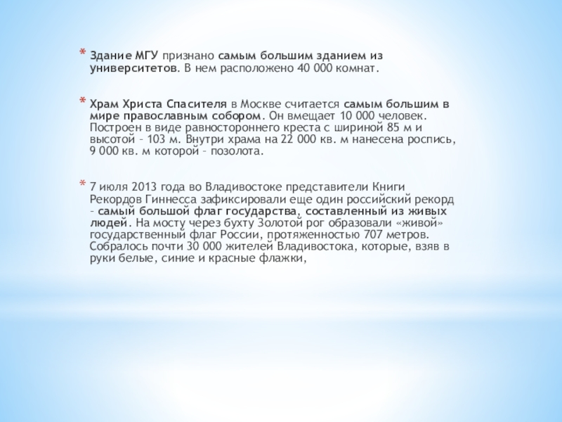 Здание МГУ признано самым большим зданием из университетов. В нем расположено 40 000 комнат.Храм Христа Спасителя в Москве