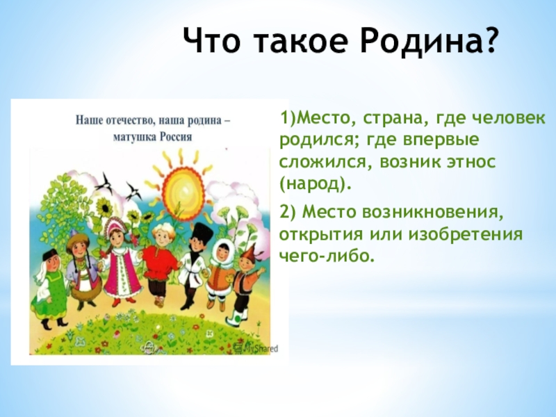 Что такое Родина?1)Место, страна, где человек родился; где впервые сложился, возник этнос (народ).2) Место возникновения, открытия или