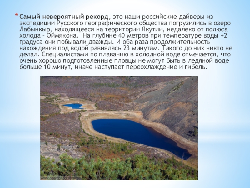 Самый невероятный рекорд, это наши российские дайверы из экспедиции Русского географического общества погрузились в озеро Лабынкыр, находящееся