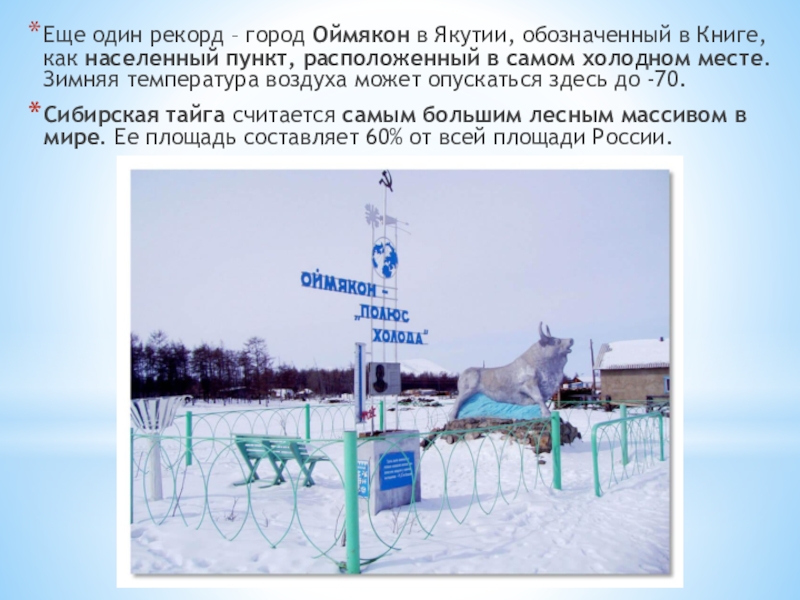 Слайд 10Еще один рекорд – город Оймякон в Якутии, обозначенный в Книге,