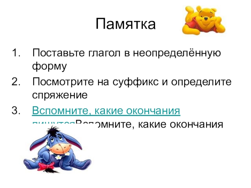 ПамяткаПоставьте глагол в неопределённую формуПосмотрите на суффикс и определите спряжениеВспомните, какие окончания пишутсяВспомните, какие окончания пишутся.