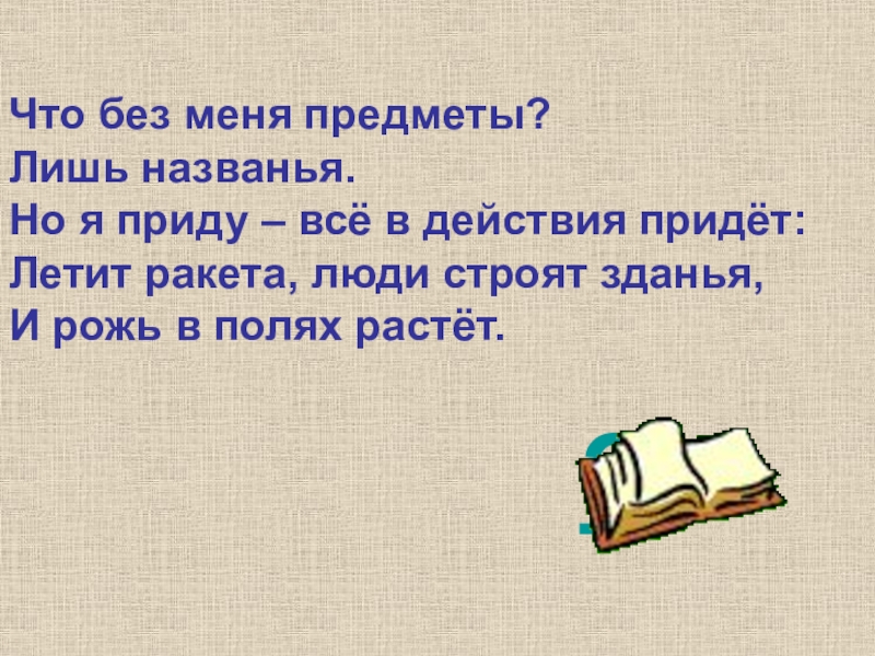 Что без меня предметы? Лишь названья. Но я приду – всё в действия придёт: Летит ракета, люди