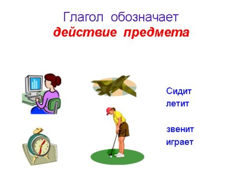 ГлаголЗначимая часть речи, которая отвечает на вопросы:Что делает?Что делал?И обозначает действие предмета