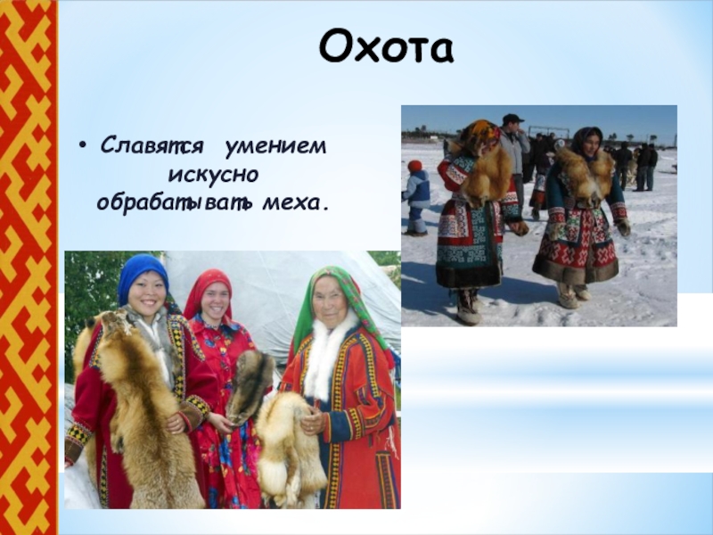Слайд 12Славятся умением искусно обрабатывать меха.