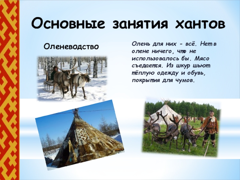 ОленеводствоОсновные занятия хантовОлень для них - всё. Нет в олене ничего, что не использовалось бы. Мясо съедается.