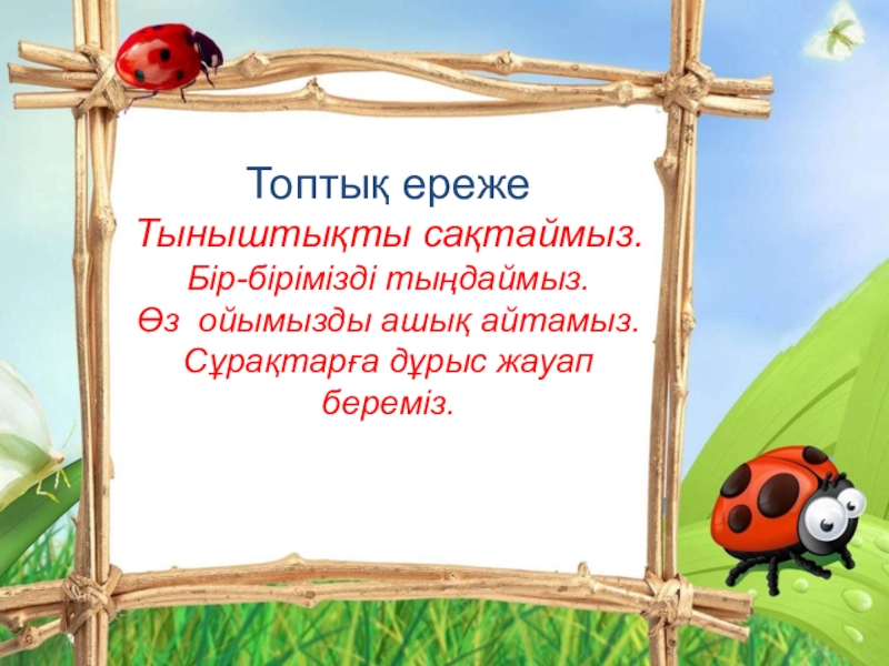 Топтық ереже Тыныштықты сақтаймыз.Бір-бірімізді тыңдаймыз.Өз ойымызды ашық айтамыз.Сұрақтарға дұрыс жауап береміз.