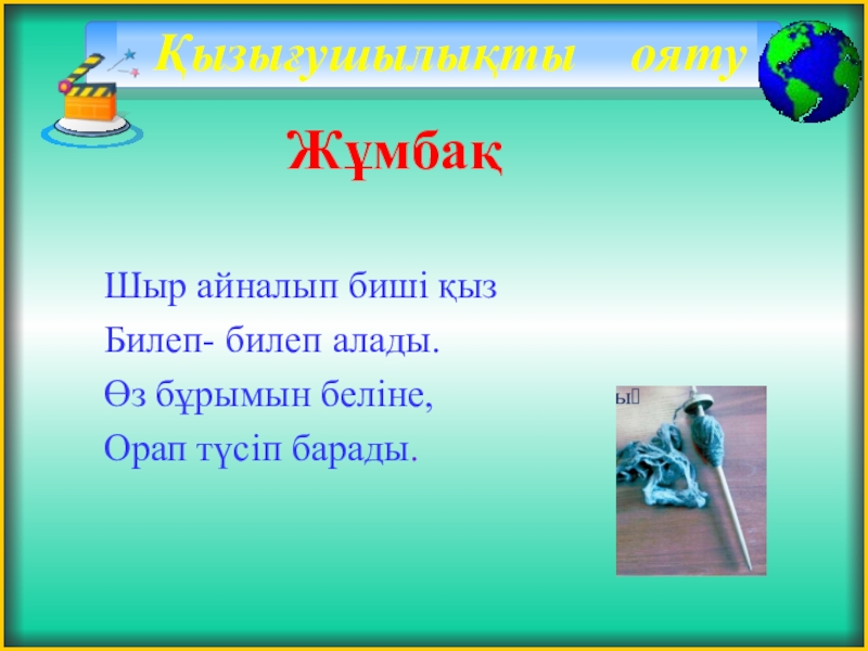 Қызығушылықты  ояту  Жұмбақ Шыр айналып биші қызБилеп- билеп алады.Өз бұрымын беліне,Орап түсіп барады.