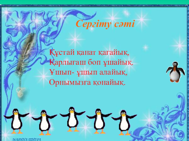 Сергіту сәті 	 Құстай қанат қағайық,Қарлығаш боп ұшайық.Ұшып- ұшып алайық,Орнымызға қонайық.