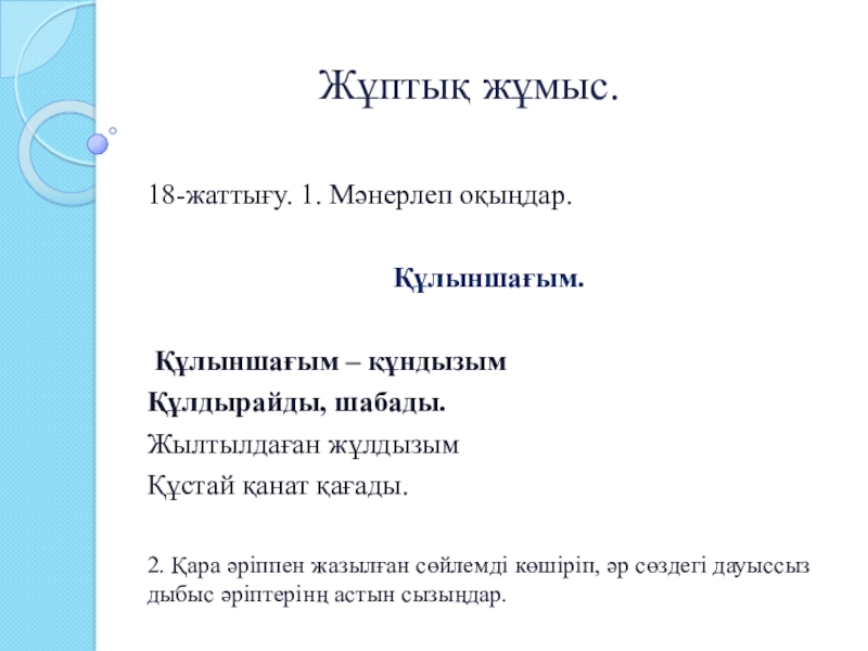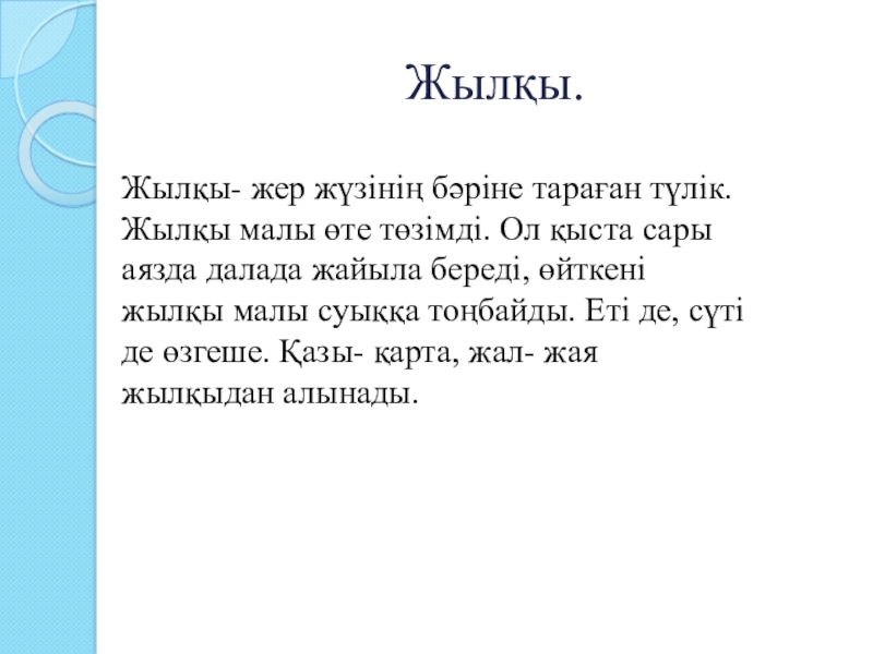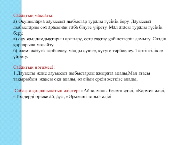 1.Дауысты және дауыссыз дыбыстарды ажырата алады,Мал атасы тақырыбын жақсы оқи алады, өз ойын еркін жеткізе алады,
