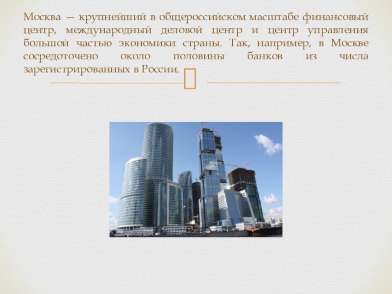 Слайд 5Москва — крупнейший в общероссийском масштабе финансовый центр, международный деловой центр