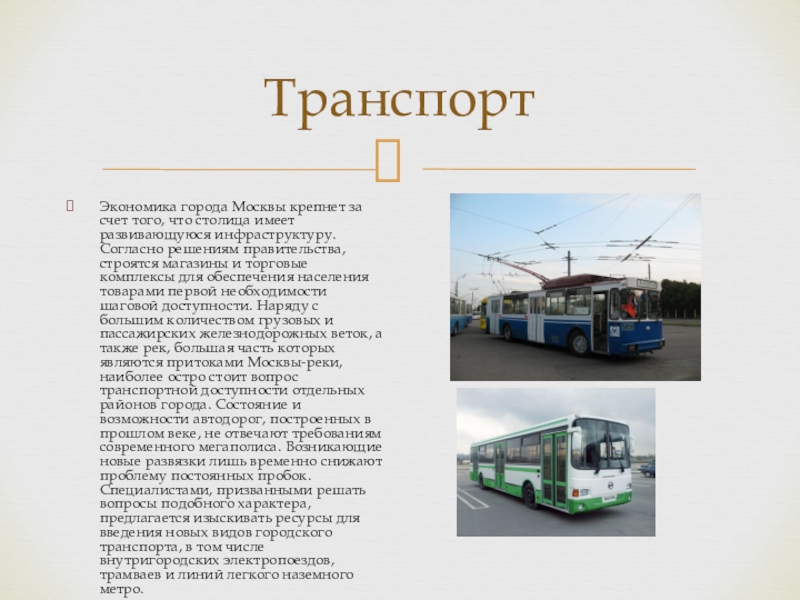 развивающуюся инфраструктуру. Согласно решениям правительства, строятся магазины и торговые комплексы для обеспечения населения товарами первой необходимости шаговой доступности. Наряду с большим количеством грузовых и пассажирских железнодорожных веток, а также рек, большая часть которых являются притоками Москвы-реки, наиболее остро стоит вопрос транспортной доступности отдельных районов города. Состояние и возможности автодорог, построенных в прошлом веке, не отвечают требованиям современного мегаполиса. Возникающие новые развязки лишь временно снижают проблему постоянных пробок. Специалистами, призванными решать вопросы подобного характера, предлагается изыскивать ресурсы для введения новых видов городского транспорта, в том числе внутригородских электропоездов, трамваев и линий легкого наземного метро.