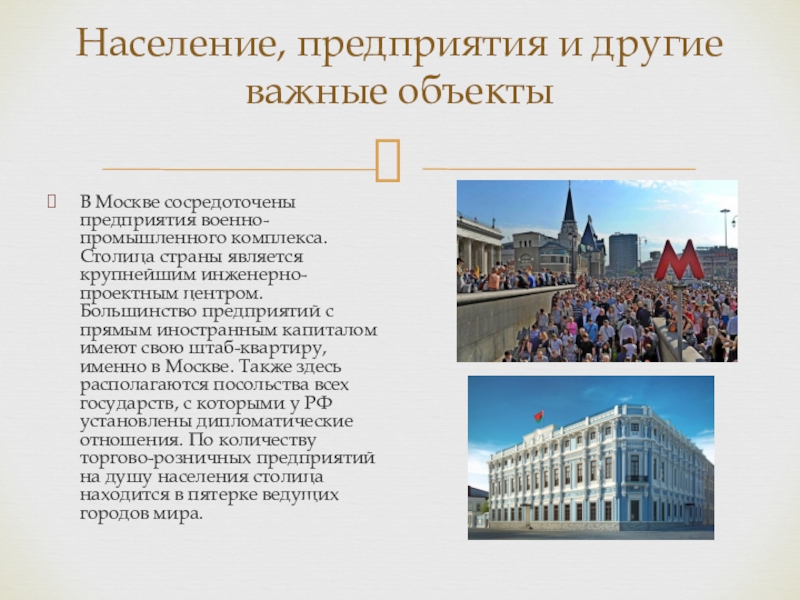 комплекса. Столица страны является крупнейшим инженерно-проектным центром. Большинство предприятий с прямым иностранным капиталом имеют свою штаб-квартиру, именно в Москве. Также здесь располагаются посольства всех государств, с которыми у РФ установлены дипломатические отношения. По количеству торгово-розничных предприятий на душу населения столица находится в пятерке ведущих городов мира.