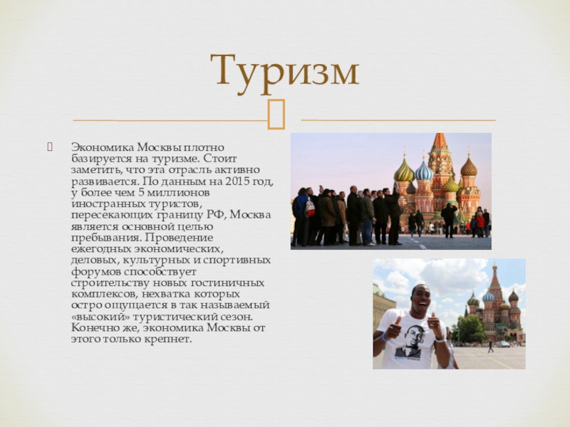 активно развивается. По данным на 2015 год, у более чем 5 миллионов иностранных туристов, пересекающих границу РФ, Москва является основной целью пребывания. Проведение ежегодных экономических, деловых, культурных и спортивных форумов способствует строительству новых гостиничных комплексов, нехватка которых остро ощущается в так называемый «высокий» туристический сезон. Конечно же, экономика Москвы от этого только крепнет.