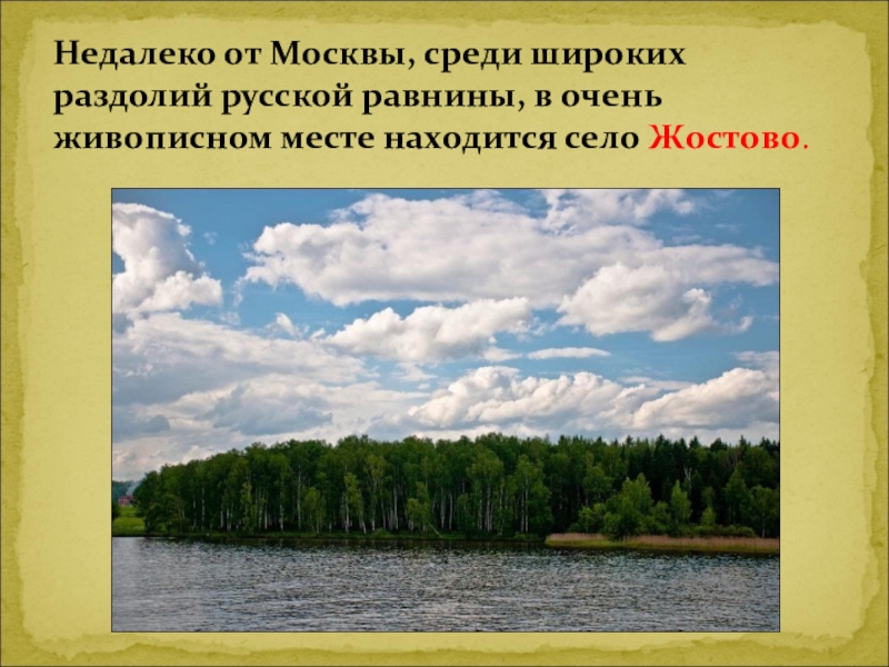 Недалеко от Москвы, среди широких раздолий русской равнины, в очень живописном месте находится село Жостово.