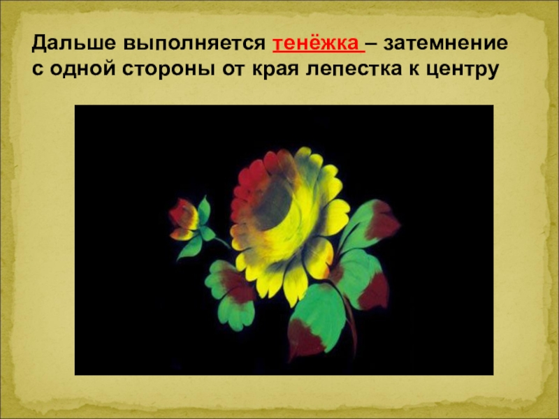Слайд 14Дальше выполняется тенёжка – затемнение с одной стороны от края лепестка