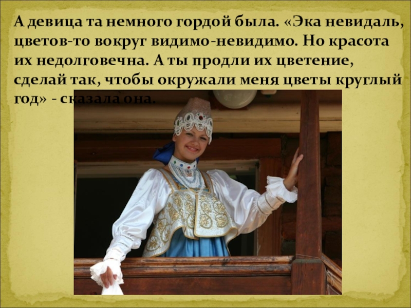 Слайд 6А девица та немного гордой была. «Эка невидаль, цветов-то вокруг видимо-невидимо.
