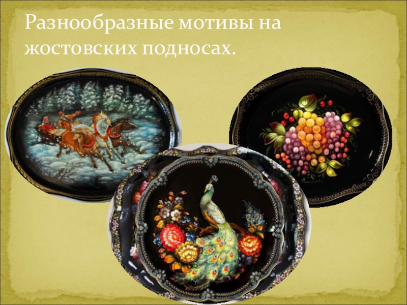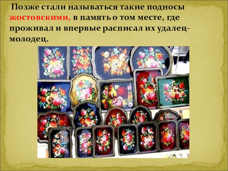Слайд 11 Позже стали называться такие подносы жостовскими, в память о том