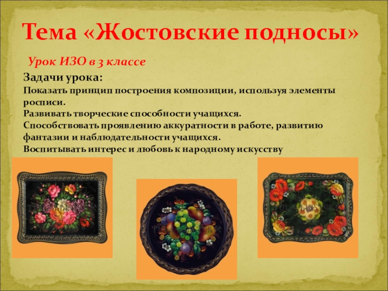 Слайд 2Тема «Жостовские подносы» Урок ИЗО в 3 классе Задачи урока: Показать принцип