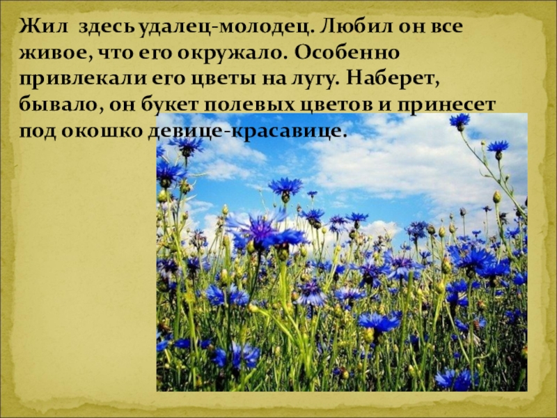 Жил здесь удалец-молодец. Любил он все живое, что его окружало. Особенно привлекали его цветы