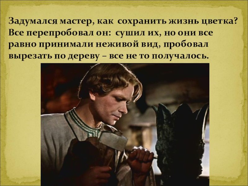 Слайд 7Задумался мастер, как сохранить жизнь цветка? Все перепробовал он: сушил их,