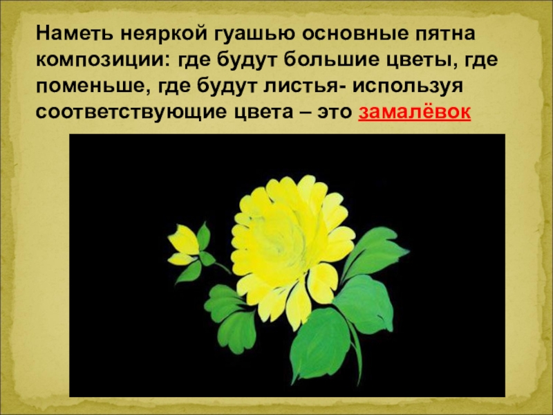 Слайд 13Наметь неяркой гуашью основные пятна композиции: где будут большие цветы, где