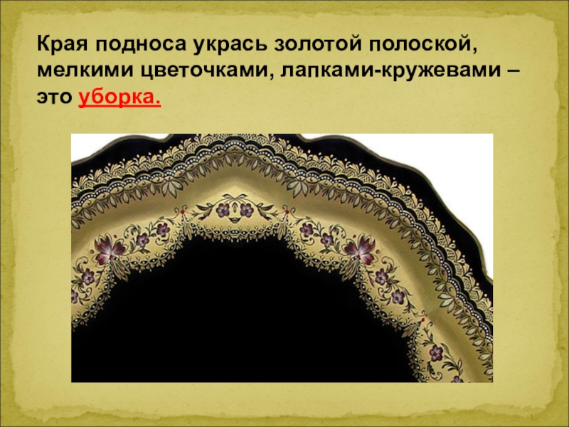 Слайд 18Края подноса укрась золотой полоской, мелкими цветочками, лапками-кружевами – это уборка.