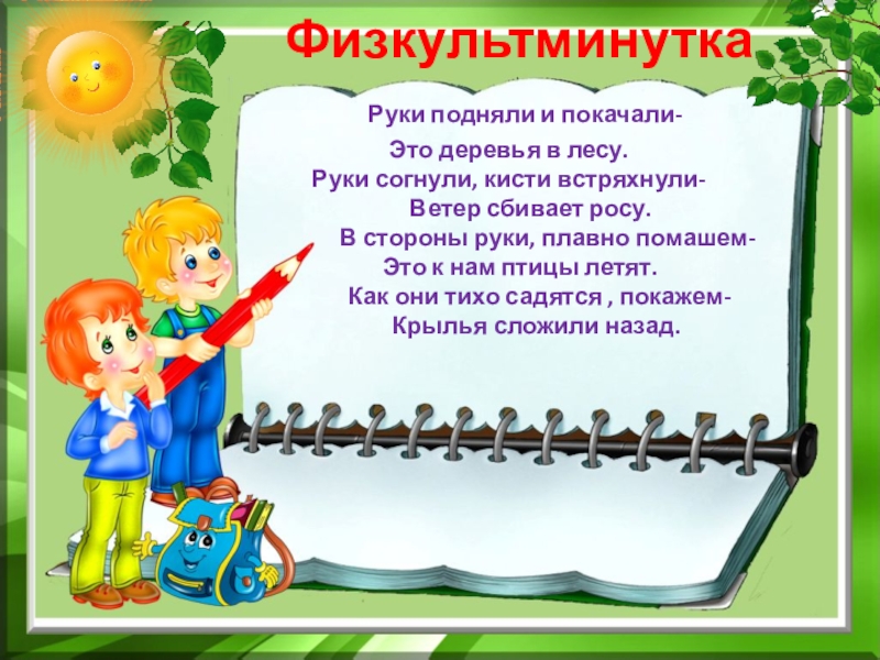 Руки подняли и покачали- Это деревья в лесу. Руки согнули, кисти встряхнули- Ветер сбивает росу. В стороны руки, плавно помашем- Это к нам птицы летят. Как они тихо садятся , покажем- Крылья сложили назад.