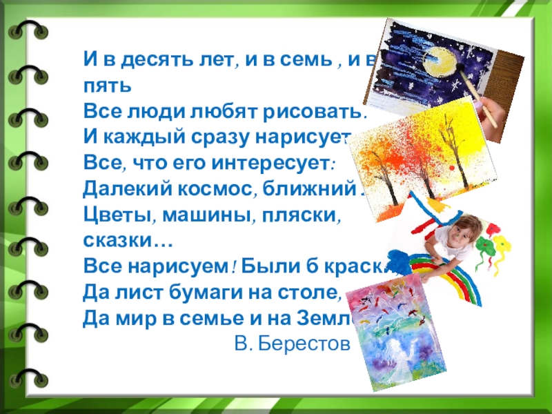 И в десять лет, и в семь , и в пятьВсе люди любят рисовать.И каждый сразу нарисуетВсе,