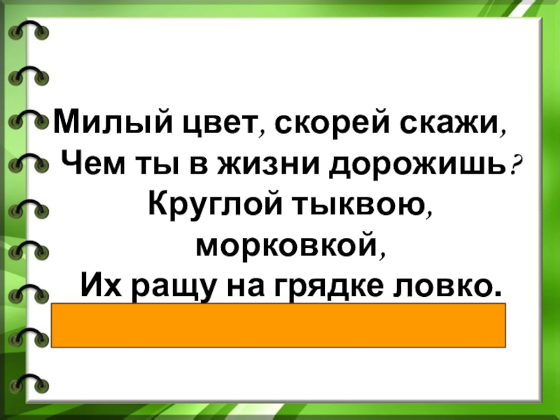 Милый цвет, скорей скажи, Чем ты в жизни дорожишь? Круглой тыквою, морковкой, Их ращу на грядке ловко.