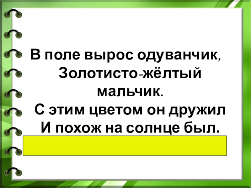 В поле вырос одуванчик, Золотисто-жёлтый мальчик. С этим цветом он дружил И похож на солнце был.