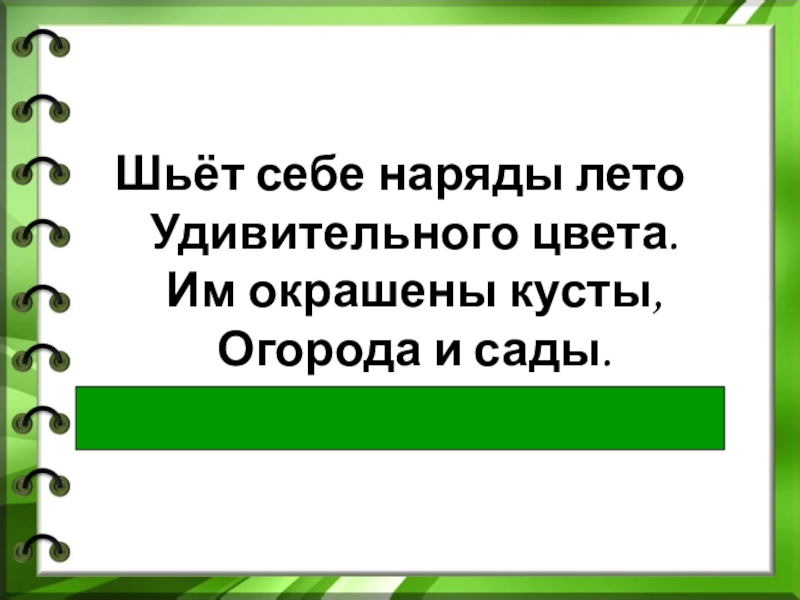 Шьёт себе наряды лето Удивительного цвета. Им окрашены кусты, Огорода и сады.