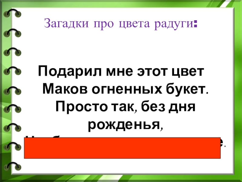 Загадки про цвета радуги:Подарил мне этот цвет Маков огненных букет. Просто так, без дня рожденья, Чтоб улучшить