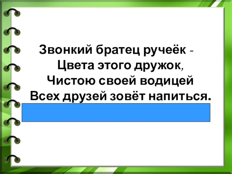 Звонкий братец ручеёк -  Цвета этого дружок, Чистою своей водицей Всех друзей зовёт напиться.