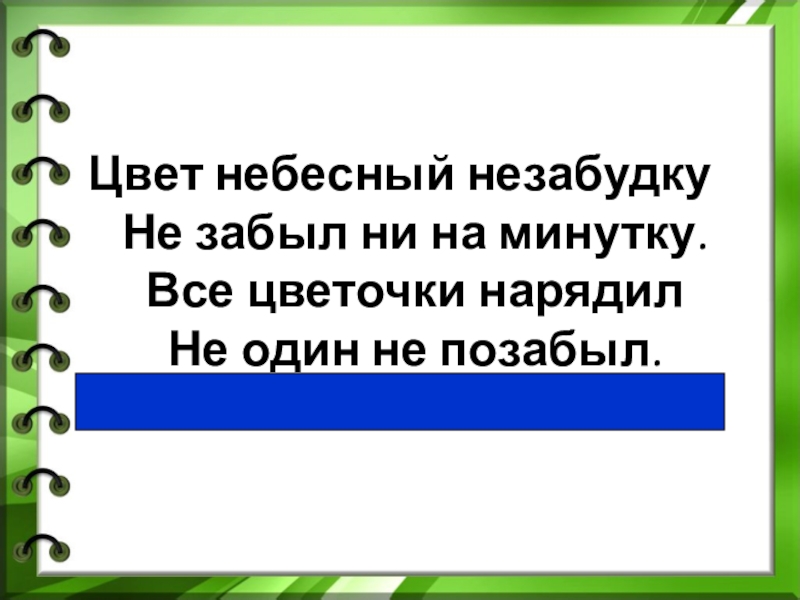 Цвет небесный незабудку Не забыл ни на минутку. Все цветочки нарядил Не один не позабыл.