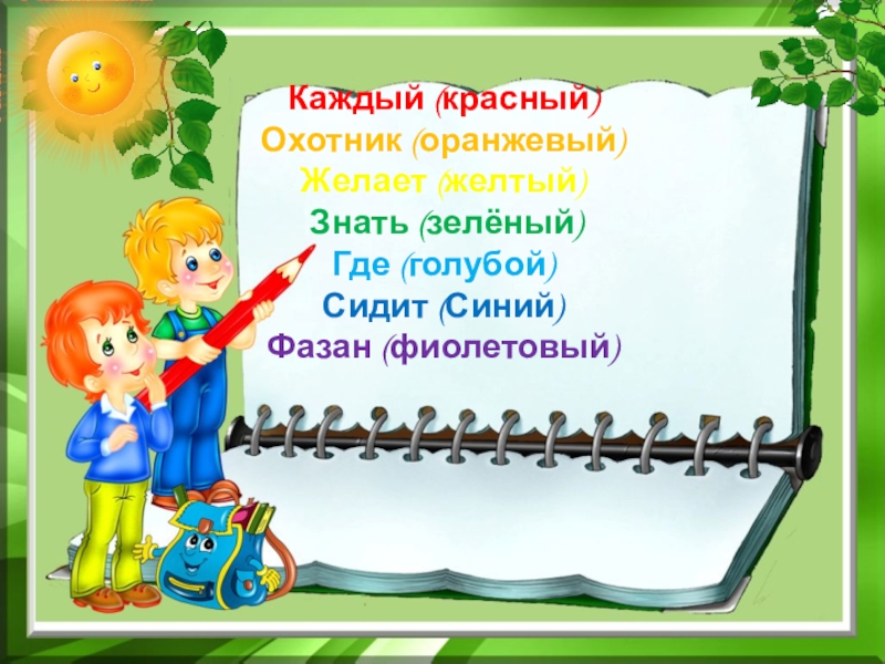 Слайд 13Каждый (красный) Охотник (оранжевый) Желает (желтый) Знать (зелёный) Где (голубой) Сидит (Синий) Фазан (фиолетовый)